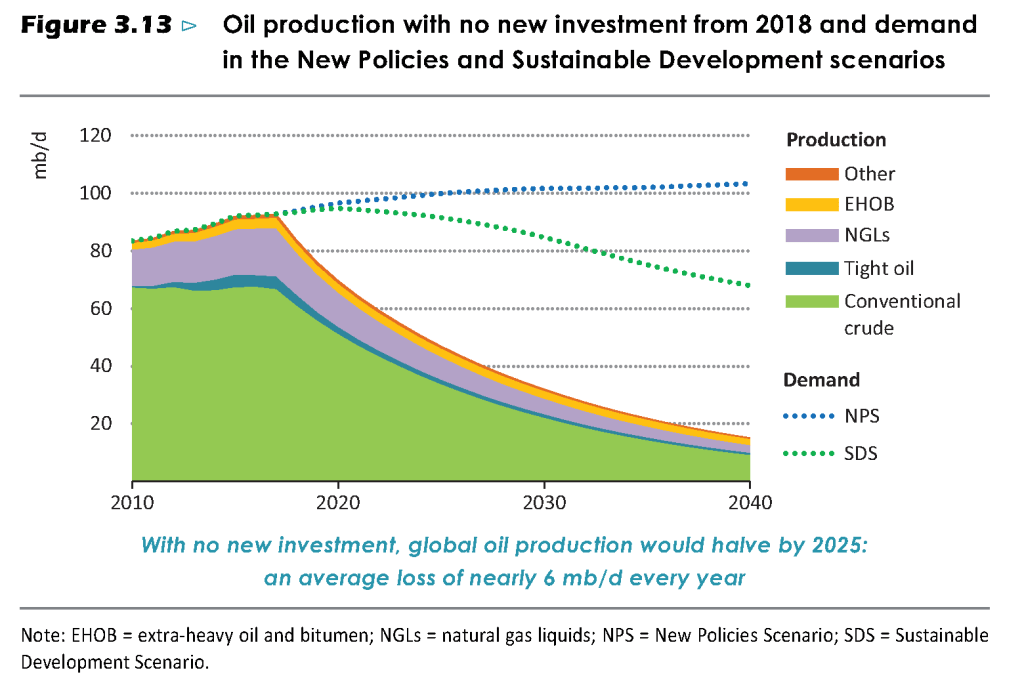 Hoy el petróleo es aún el rey de los combustibles fósiles y la principal de nuestras fuentes de energía. Pero ya va quedando menos petróleo decente. El crudo que se extrae es cada vez de peor calidad, más sucio y más difícil de obtener, en regiones polares o en yacimientos submarinos a gran profundidad. Ya no es una inversión rentable. Por eso, la IEA advierte que sin fuertes inversiones adicionales, tendremos un déficit de producción del 84% en 2040. Y hay evidencias de que los principales derivados líquidos del petróleo van escasear, especialmente el Diesel y los fuelóleos.