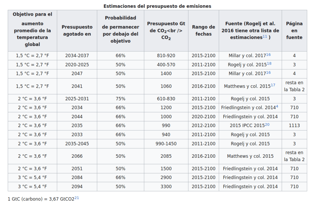 Todas las estimaciones, que presentan un capital restante de contaminación entre 800 y 1000 gigatoneladas (GtCO2), admiten una baja probabilidad, típicamente en torno al 50-60%, de cumplimiento del objetivo de limitar el calentamiento a 1,5 ºC o 2,0 ºC. Todas las estimaciones, además, pecan al subestimar las interacciones y realimentaciones entre distintos fenómenos vinculados al calentamiento global.