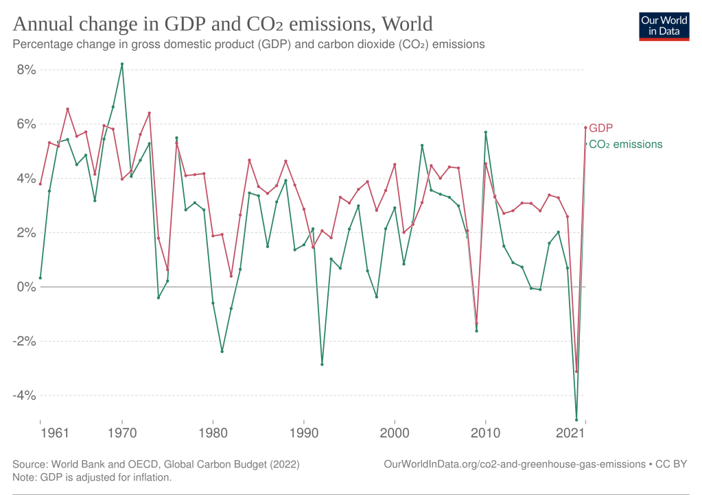 Cambios anuales en PIB y emisiones de CO2, globalmente: