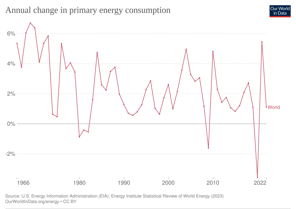 Con un crecimiento económico de un 2,3% anual, en 100 años la economía, medida en el PIB -Producto Interior Bruto, se habrá multiplicado por 10. Y con ella, también el consumo de energía, ya que globalmente se suelen acompañar – como se ve en estos gráficos de «Our World in Data»:
